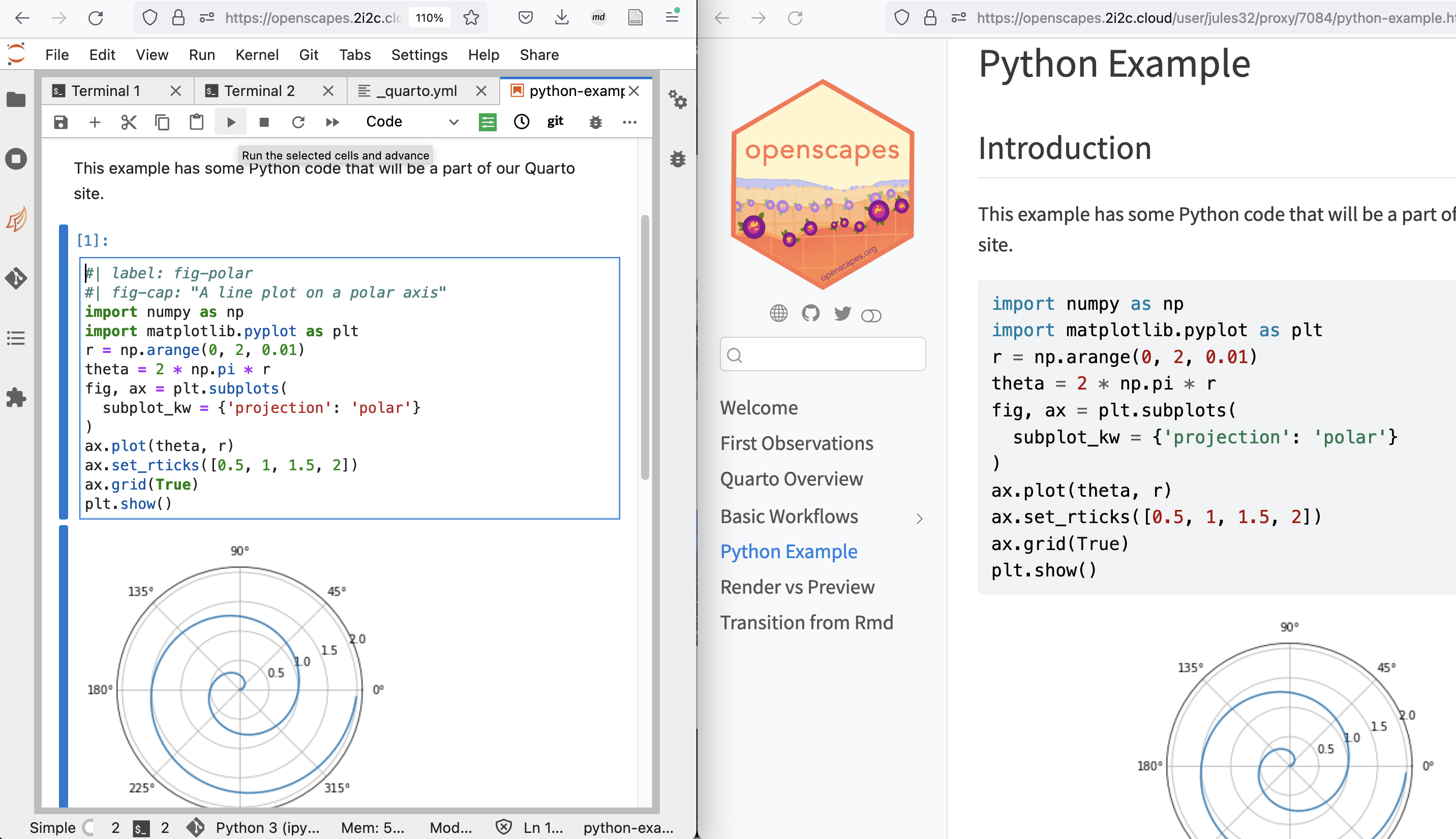 Here we will demonstrate how to work with this Quarto tutorial site in JupyterHub and add a Jupyter Notebook (.ipynb file). This example uses the NASA-Openscapes JupyterHub that already has all python environments as well as Quarto installed.