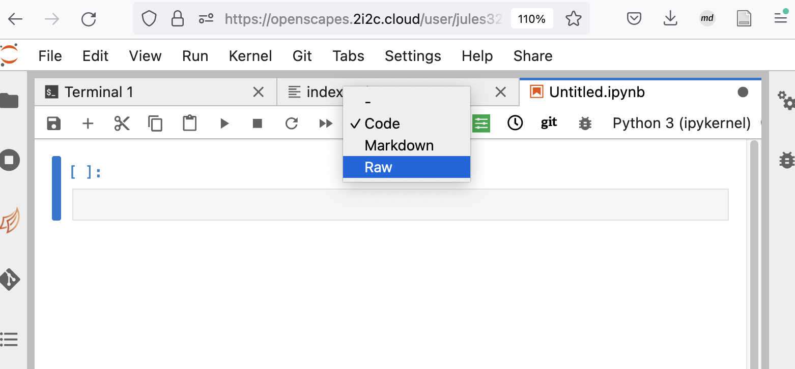By default, this Notebook will give us a first chunk that is code. Let’s change it to raw so that we can write our yaml at the top.